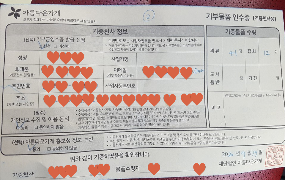 물건은 바로 확인하는곳으로 이동되었고, 기증을 한다는 내용의 서명과 함께 제가 기부영수증을 받게될 주소 연락처 등과 함께 개인정보 동의 등의 수신을 하도록 되어있는 간단한 서류를 작성하였습니다.
