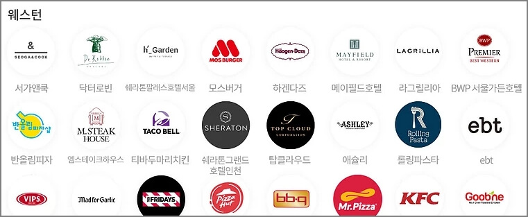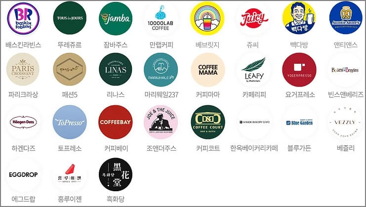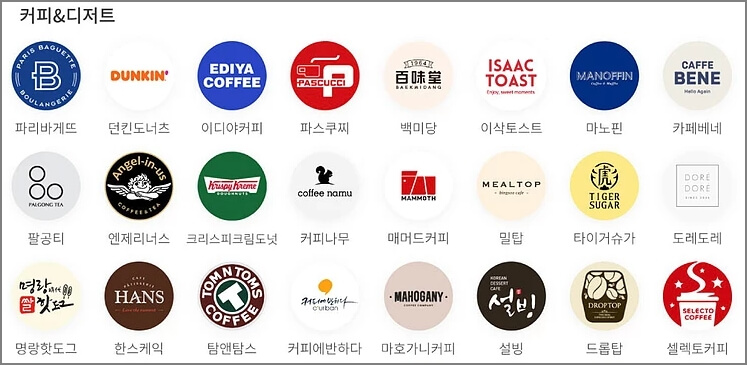사용처를 알아보겠습니다. 크게는 커피 디저트/ 아시안 푸드/ 웨스턴이라는 항목으로 나눠져 있습니다. 한눈에 봐도 우리가 자주 가는 매장들이 많이 보이는 것을 확인할 수 있습니다 매장 정보는 참고해 주십시오