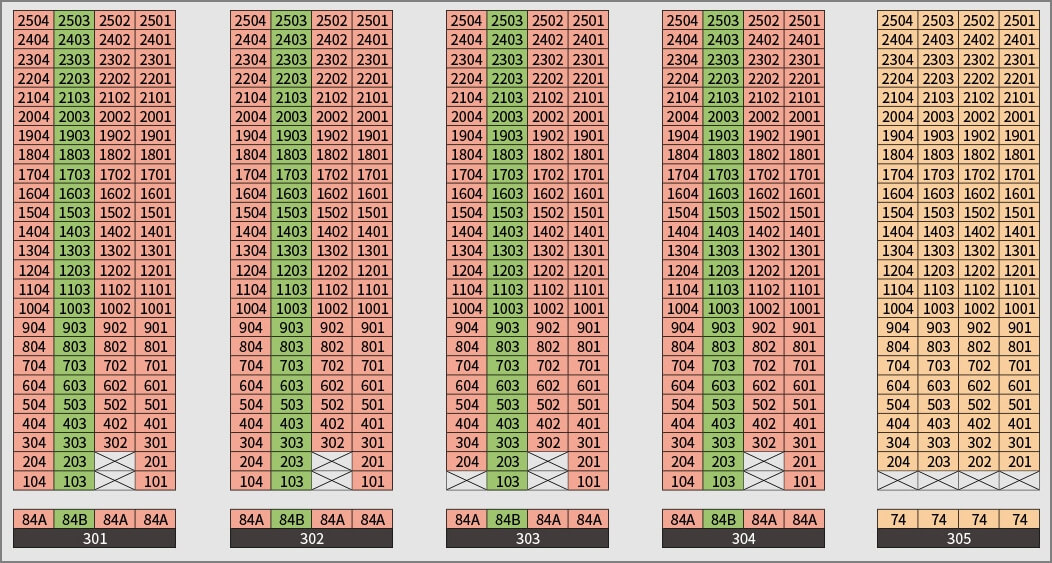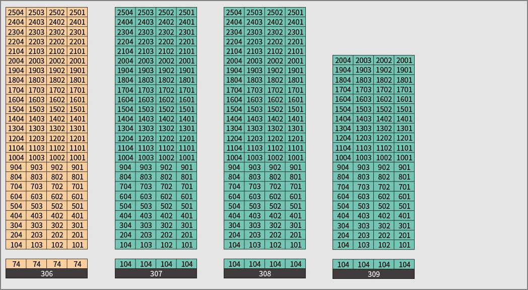 아파트의 동을 301동부터 309동까지 총 9개의 동으로 이루어져 있으며, 309동을 제외한 8개 의 아파트는 1 ~ 4호까지 25층으로 되어 있고, 309동만 20층까지 되어 있습니다.