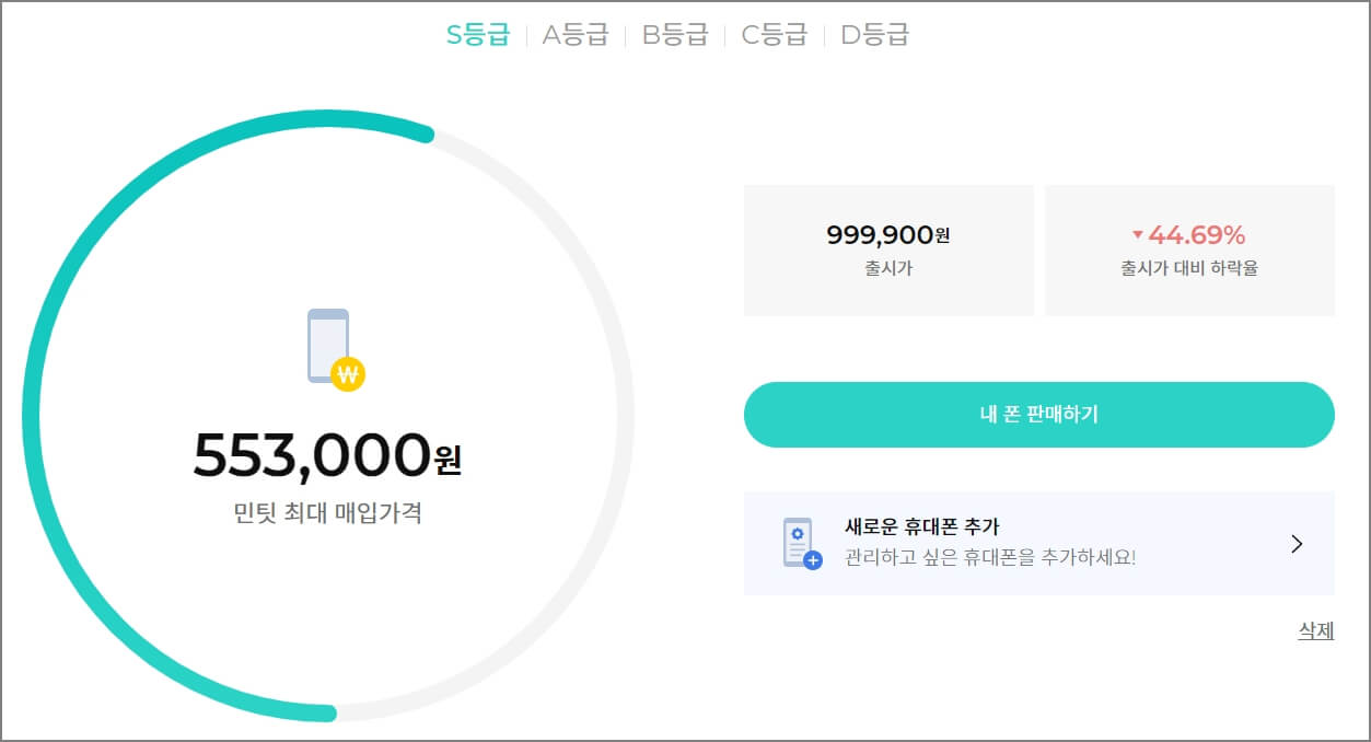 민팃에서는 각 기기별로 S/A/B/C/D 등급의 시세를 책정하여 해당 조건에 만족되는 각 기기값 설정해 놓은 상태입니다. 그래서 본인이 하려고 마음 먹은 핸드폰에 시세를 확인을 한 후에 가격이 맞으면 판매하면 됩니다.