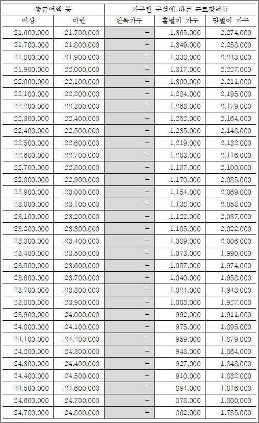 단독가구 / 홑벌이 가구 / 맞벌이 가구 3가지 유형에서도 각가의 소득 금액 범위에 따라 지원금액이 다르게 되어 있습니다. 아래에서 살펴보도록 하겠습니다