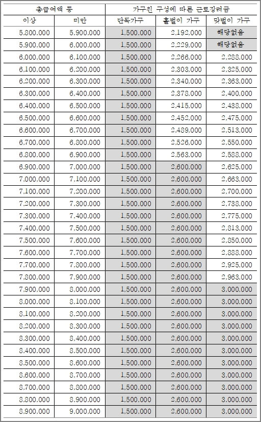소득 구단별로 아주 자세하게 나와있는 표를 아래에 삽입해 드리겠습니다. 본인의 총 급여액을 확인하신 후 오른쪽 열애 있는 열에 있는 대상에 맞춰서 지원금액을 확인해 보세요.