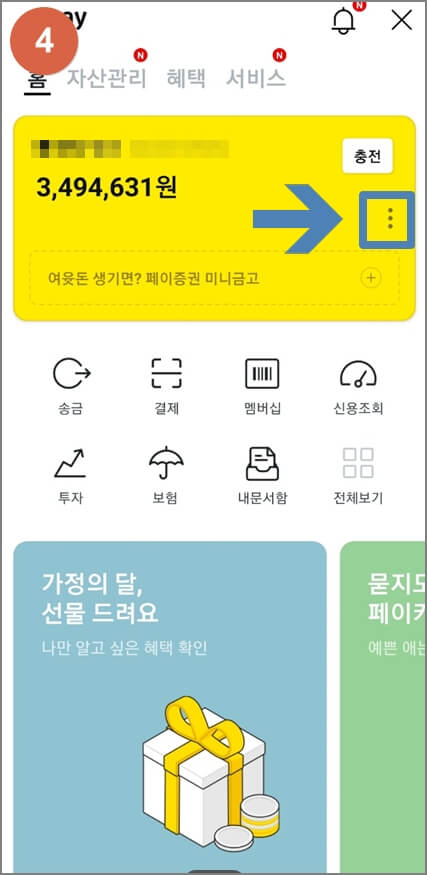- 카카오페이를 눌러지면 페이 지갑으로 이동이 되실거고 노란박스 안에서 다시한번 쩜쩜쩜 모양을 클릭해 주세요