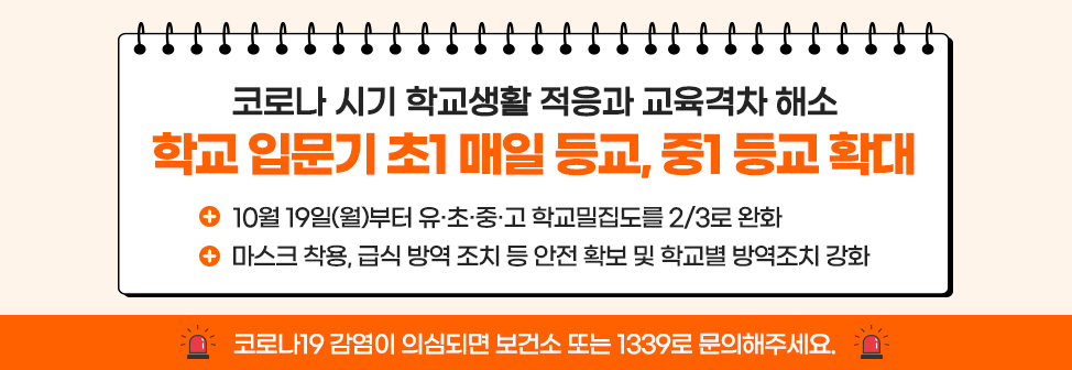 거리두기 1단계 하향과 더불어, 학교생활 적응 문제 그리고 학생 성장의 어려움을 극복하기 위한 취지의 결정으로 보여집니다만 예측이 불가한 시기에 적절한 조치인지는 추후 지켜봐야 할 것 같습니다.