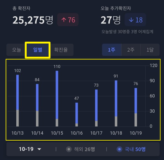 일별 모드를 클릭해주시면 기본적으로 1주일간의 확진 내용중 국내와 해외를 구분하여 확인할수 있고, 2주 그리고 한달까지의 확진 추이를 확인하실수 있으십니다.