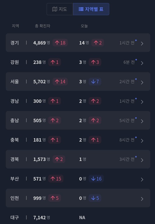 지도에 있는 보기를 좀더 세부적으로 표시해 준 것으로 보시면 되며, 지역별 최종 업데이트 시간 그리고 총 확진자 수를 확인 하실 수 있습니다.