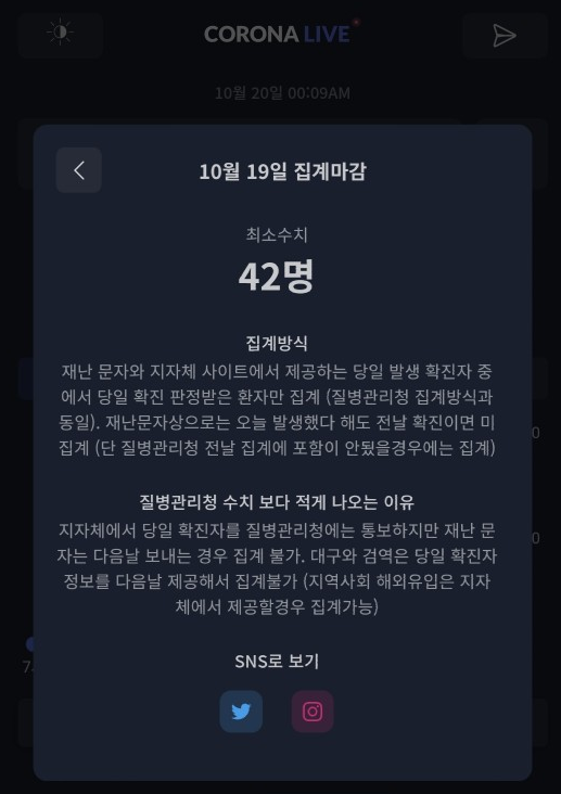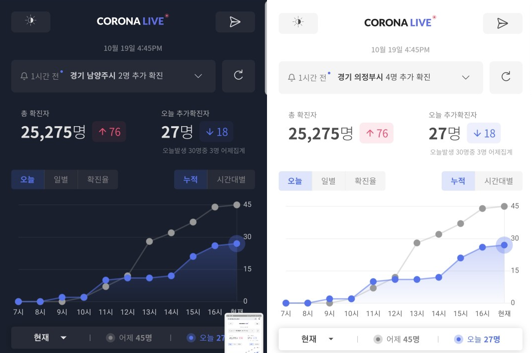 - 질병관리청과 재난문자를 기준으로 집계하고 있어 공식적으로 발표하는 수치와 완벽히 일치 하지는 않아 어느정도 참고 필요