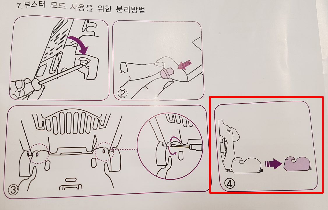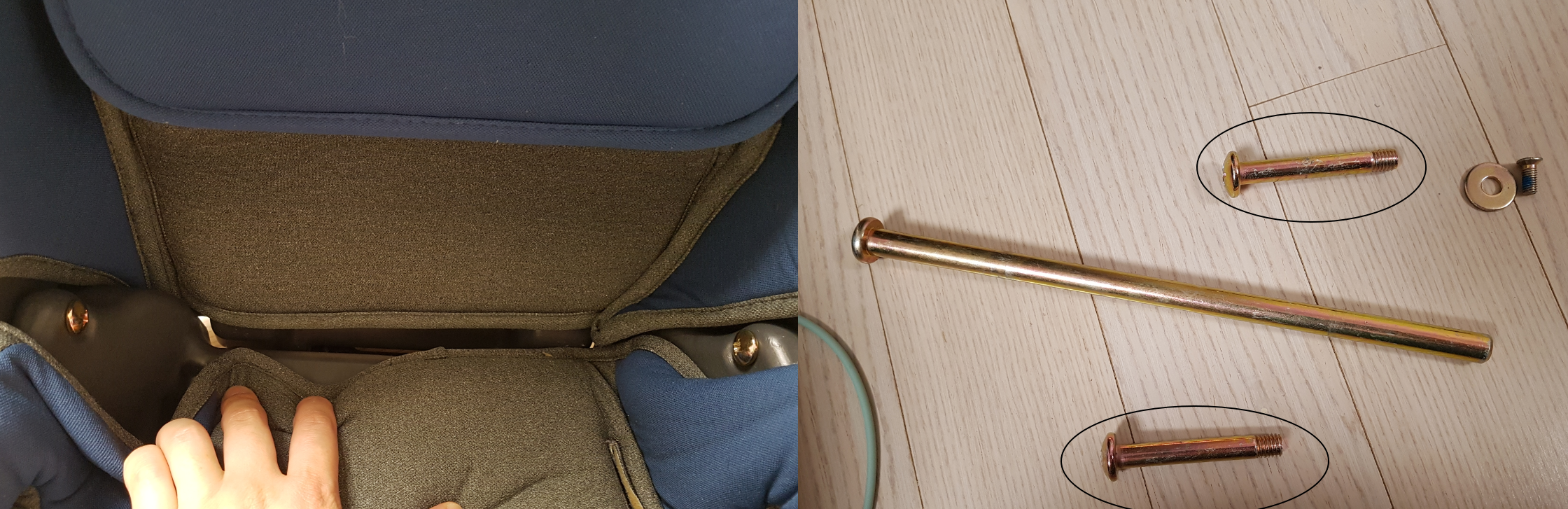 카시트를 뒤집어보면 90도로 꺽인 부분 그렇니까 의자의 등받이와 의자 부분에 아래 그림과 같은 나사 연결이 좌우로 되어 있습니다.