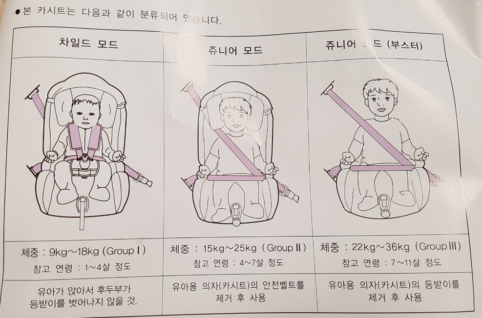 둘째가 태어났을때 첫째가 쓰던 카시트를 둘째가 쓰게 되었고, 가족으로부터 선물을 받게되었을때 첫째의 주니어 카시트를 선물 받았던것이 기억이 납니다.