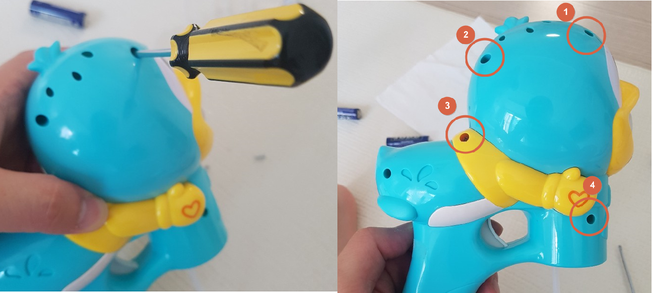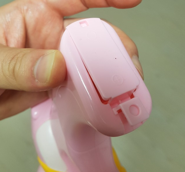 분홍색 버블건은 건전지 교체만으로 점검이 끝났고, 건전지는 아래 사진과 같이 손잡이 하단을 보시면 삽입구역을 확인하실수 있을 것 입니다.