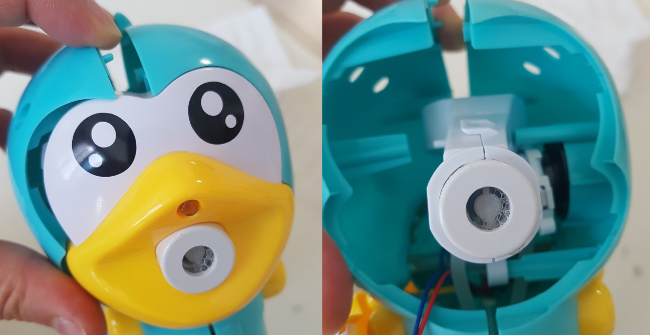 분홍색 버블건과 비교를 해보니 분홍색 버블건은 작동을 하면 버블을 뿜는 주둥이 안의 동그란 물체가 시계방향으로 도는 차이점을 발견할수 있었습니다.